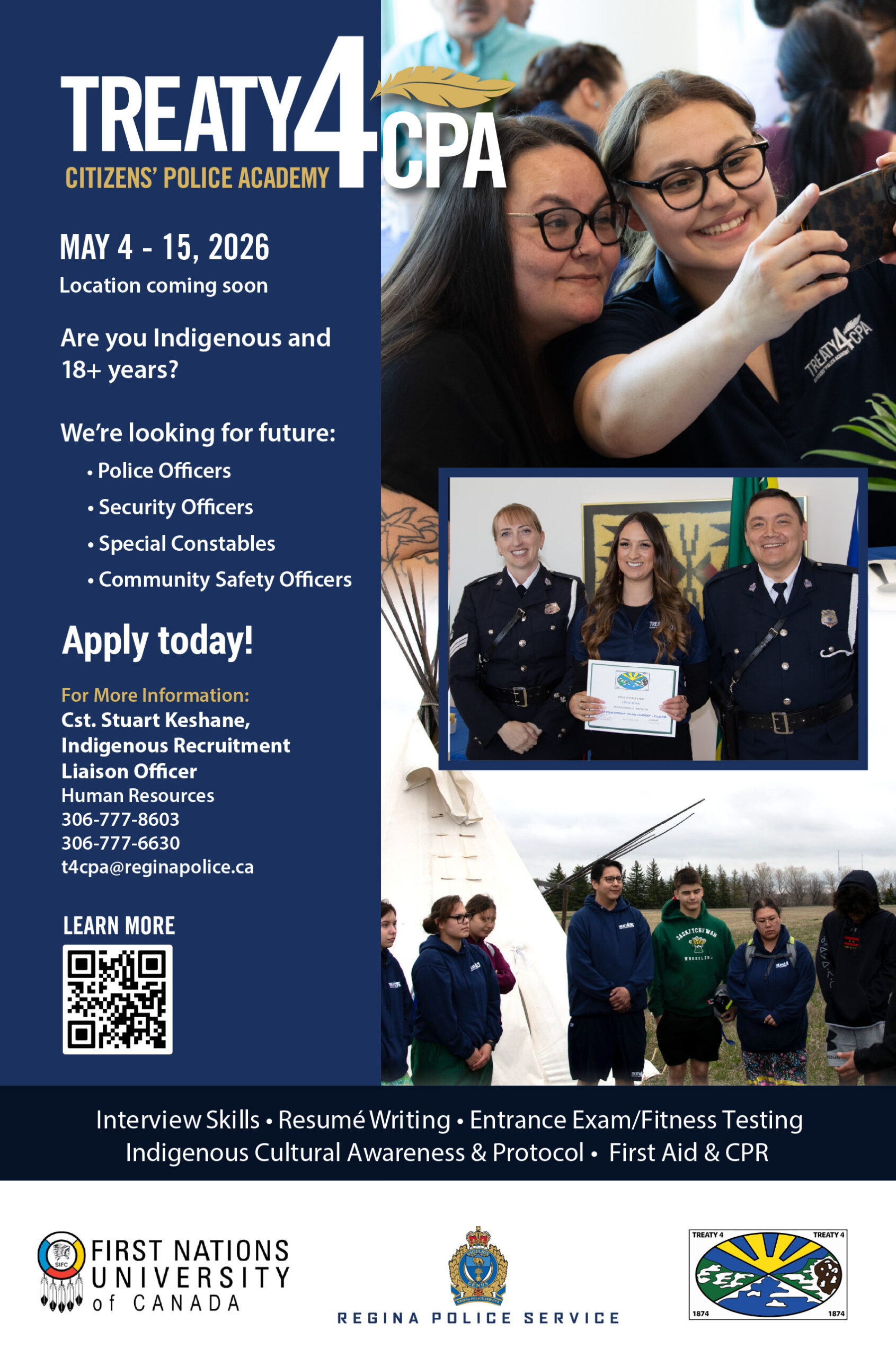 Treaty 4 Citizens’ Police Academy is a great opportunity to learn about a career in law enforcement and community safety in an immersive two-week experience. Are you 18 or older, Indigenous and looking for a career as a Police Officer, Community Safety Officer, Special Constable or a Security Officer? Treaty 4 CPA is designed for you! Attendees will spend two weeks on campus at the Saskatchewan Police College immersed in the world of law enforcement.